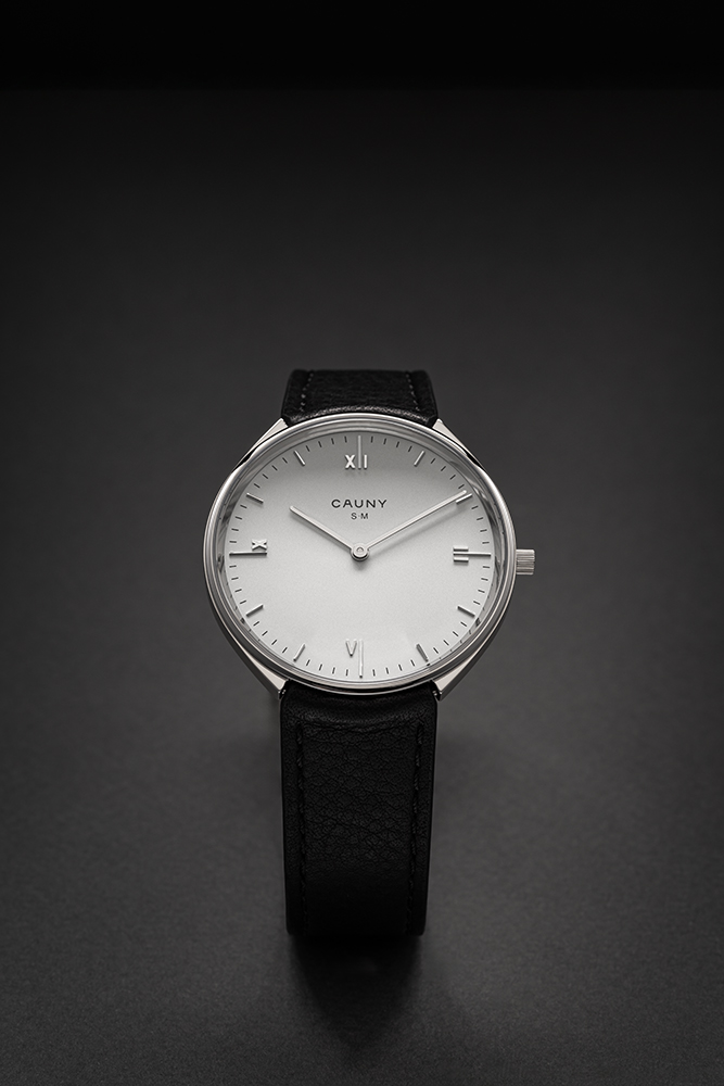 ソウト・モウラのサインが入ったグレーの文字盤は、12、3、6、9の位置に細長いローマ数字を軸として配置しています。